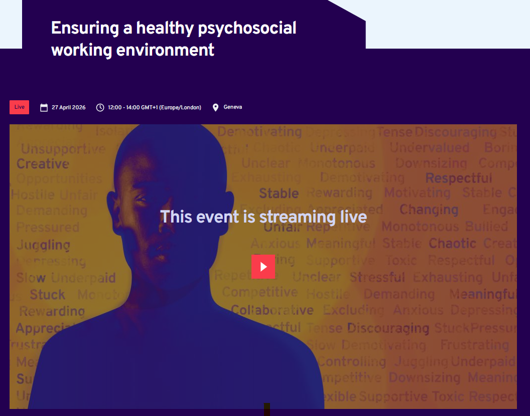 In commemorating the World Day for Safety and Health at Work 2026, this event brings together ILO constituents, ministers and international experts to discuss global developments and practical pathways for ensuring a healthy psychosocial working environment.