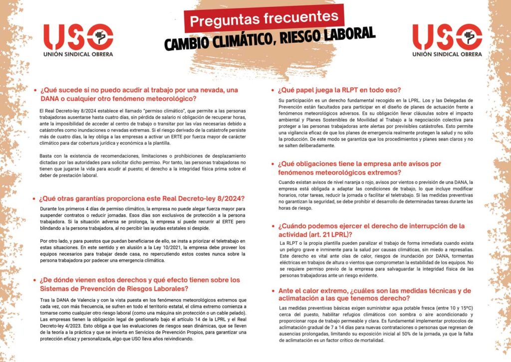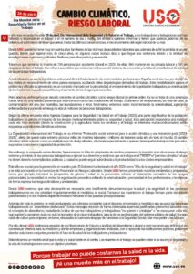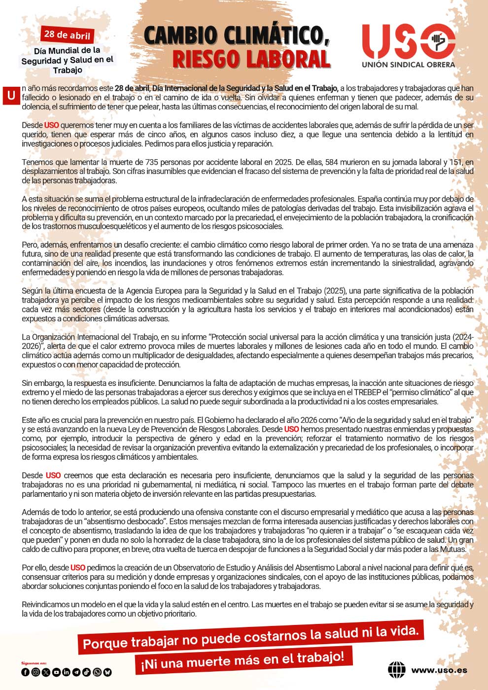 Por ello, desde USO consideramos imprescindible poner en el foco datos, estadísticas, estudios y análisis que, ante el próximo Día Mundial de la Seguridad y la Salud en el Trabajo, evidencian esta nueva realidad laboral. Mientras las empresas mantienen una actitud reactiva y las instituciones avanzan con marcos normativos en fase de desarrollo, la siniestralidad vinculada al clima exige una intervención inmediata.